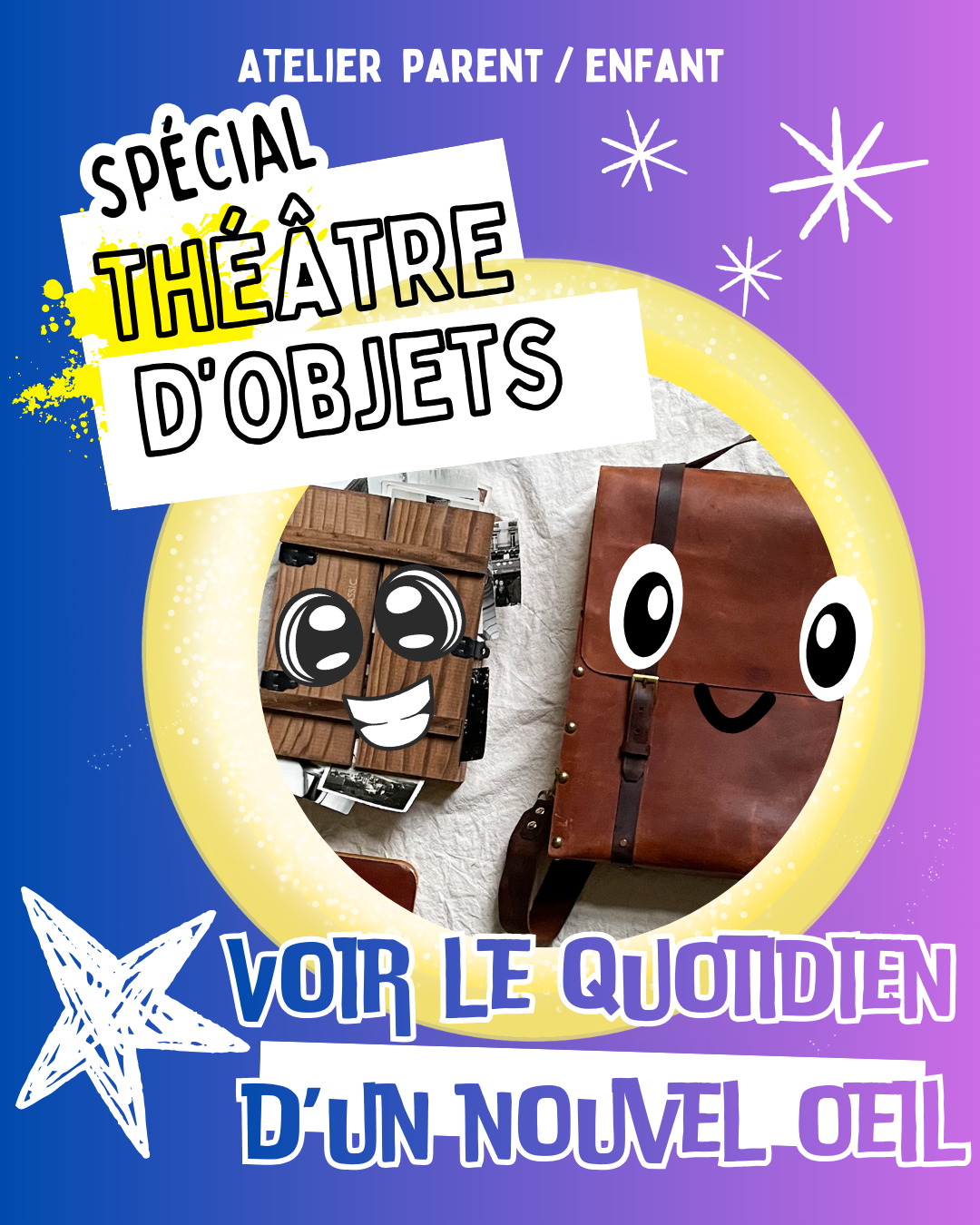 Partagez un moment créatif et complice en famille à travers le théâtre d'objets ! Cet atelier invite parents et enfants à découvrir ensemble la magie du jeu théâtral en transformant des objets du quotidien en personnages, décors ou accessoires d'histoires inventées.